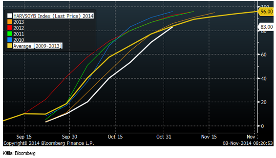 Skörden av sojabönor i USA har nu kommit helt ikapp normal takt och 83% är skördat.