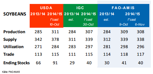FAO / AMIS sänkte estimatet för global produktion av sojabönor i torsdagens november-rapport med 1 mt till 308 mt. Det beror framförallt på sämre utsikter i Brasilien och Argentina pga torrt väder och mindre sådd areal än tidigare väntat. FAO väntar sig dock att konsumtionen ökar mindre än väntat i oktober. De sänker konsumtionen med 2 mt till 296 mt. Utgående lager 2015 sänks från oktober månads estimat med 1 mt till 40 mt. Det är dock 10 mt mer än utgående lager för 2014, enligt FAO.