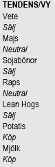 Det finns allt mer rapporter om att det ryska höstvetet är i dåligt skick, vilket är ett observandum. WASDE-rapporten kommer att vara utslagsgivande för veckan som kommer. Marknaden väntar sig att ending stocks i USA ökar från 654 till 665 miljoner bushels. Vi fortsätter med säljrekommendation, men tycker att den som inte vågar hänga med mer, mycket väl kan lägga sig neutral också.