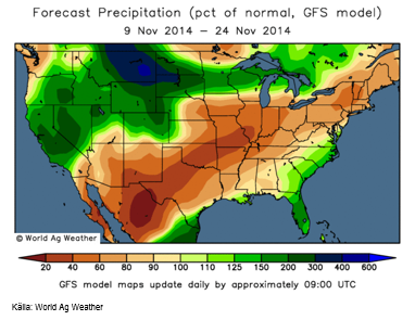 Prognoskartan för nederbörden i USA visar fortsatt torrt väder i de centrala delarna, i stater som New Mexico, Texas, Oklahoma, Arkansas, Kansas, Missouri, Illinois, Iowa och Indiana. Kalifornien, som varit extremt torrt, väntas dock få upp till tre gånger normal nederbörd. Montana och Nord- och Syddakota får upp till sex gånger normal nederbörd.