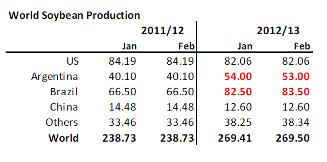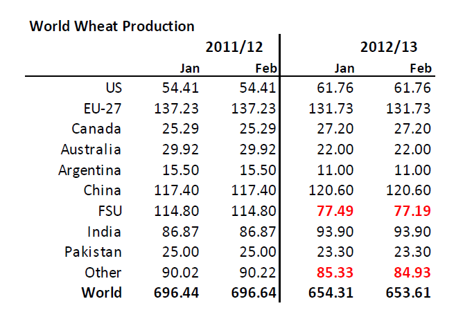 Så nu till WASDE-rapporten. USDA:s estimat (gissningar) om produktionen för 11/12 och 12/13 ser vi nedan. Man gjorde en liten sänkning endast på fd Sovjets produktion. Brasiliens (Other) sänktes också.