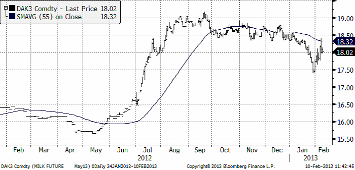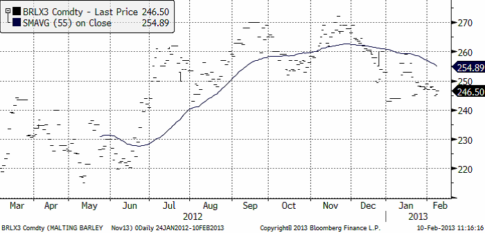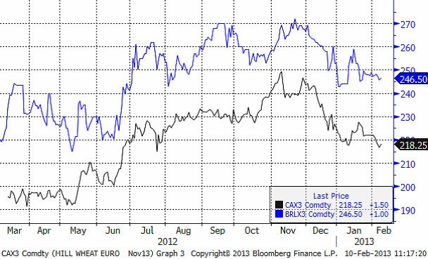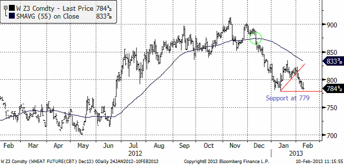 Priset på november (2013) kontraktet har den senaste tiden fallit betydligt mer än maj-kontraktet, som vi ser i diagrammet nedan. WASDE-rapporten som kom i fredags kväll, var något av en ickehändelse. WASDE-rapporten har mer bäring på novemberkontraktet än på maj-kontraktet. De något mer bullish / oroväckande nyheterna från Ryssland och Egypten påverkar inte novemberkontraktet lika mycket som majkontraktet.