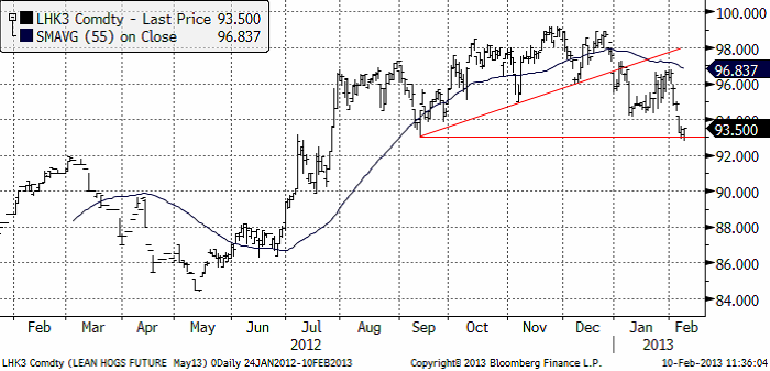 Grispriset (Maj 13) föll förra veckan ner till 93.50. Läsare av veckobrevet har tidigare kunnat läsa att rekylen uppåt efter brottet av den tekniska stödnivån skulle tolkas som ett tillfälle att sälja. Det visade sig vara rätt. Nu ligger priset på stödet och därifrån får marknaden visa vägen. Ännu ett brott nedåt innebär att prisfallet kan fortsätta.
