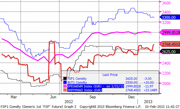 Fonterras auktion i onsdags visade på en prisuppgång på SMP. På Eurex fortsatte dock kräftgången i SMP. Prisutvecklingen på smör fortsatte att falla tillbaka efter toppen i december. I diagrammet nedan ser vi nu fyra kurvor. Den övre tunna linjen är EUREX SMP. Den nedre tunna linjen är Eurex SMP. Den rosa linjen visar priset på helmjölkspulver (WMP) FOB Västeuropa. Källan är USDA och priserna uppdateras varannan vecka. Den röda linjen är Fonterras auktion.
