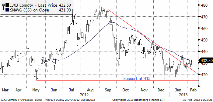 Rapspriset (november 2013) har utvecklat sig starkare än sojabönorna. Ett försök att handla rapsen högre i veckan hindrades dock av WASDE-rapporten och det betydande prisfallet efter den i sojabönsmarknaden.
