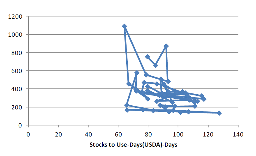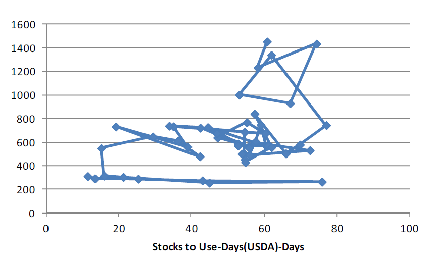 Nedan ser vi relationen mellan pris och utgående lager sedan 60-talets början. Varje punkt är ett år, per den 8 februaris pris och estimerat utgående lager varje år. Vi ser att ett lager som räcker i drygt 70 dagar och ett pris på strax under 800 cent ÄR i linje med den relation som varit rådande de senaste åren. Ju mindre lager desto högre pris. Priset ser ut att ligga rätt.