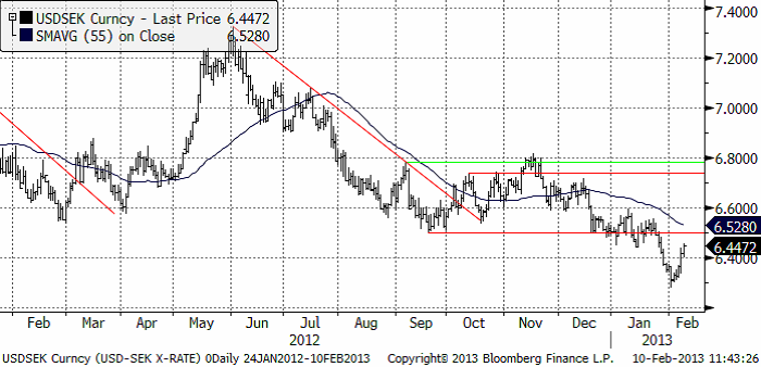 Dollarn rekylerade uppåt mot slutet av veckan. Detta ser ut knappast ut som ett trendbrott, utan som en rekyl i en fallande trend. Därmed är det ett säljtillfälle.