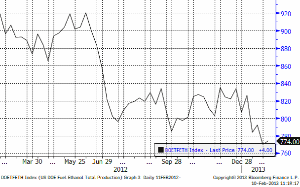 Veckovis etanolproduktion i USA ökade till 704,000 fat per dag från förra veckans rekordlåga 700,000 fat.
