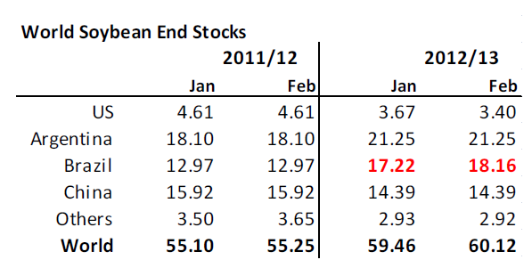 WASDE-rapportens produktionsestimat handlade helt om Sydamerika. Argentinas väntade skörd justerades ner 1 mt och Brasiliens upp lika mycket. Resten lämnades oförändrat.