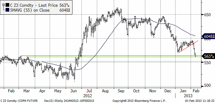 Majspriset (december 2013) föll kraftigt i veckan som gick efter att ha brutit det stöd du kunde läsa om förra veckan. Priset har nu fallit ner till ett prisområde där det finns tre ganska starka tekniska stöd. Det mest sannolika härifrån är att marknaden konsoliderar sig med sidledes rörelse, eventuellt ner mot 550 cent.