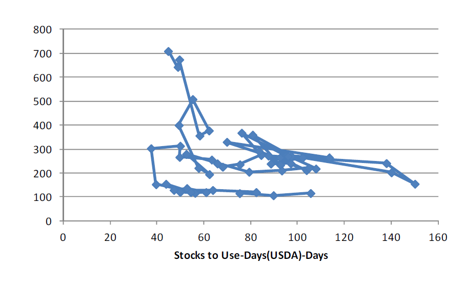Nedan ser vi relationen mellan pris och utgående lager sedan 60-talets början. Varje punkt är ett år, per den 8 februaris pris och estimerat utgående lager varje år. Vi ser att ett lager som räcker i drygt 70 dagar och ett pris på strax under 800 cent ÄR i linje med den relation som varit rådande de senaste åren. Ju mindre lager desto högre pris. Priset ser ut att ligga rätt.