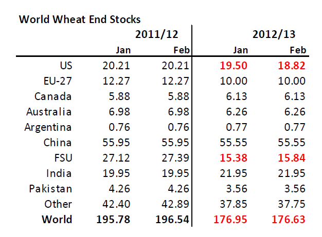 Så nu till WASDE-rapporten. USDA:s estimat (gissningar) om produktionen för 11/12 och 12/13 ser vi nedan. Man gjorde en liten sänkning endast på fd Sovjets produktion. Brasiliens (Other) sänktes också.