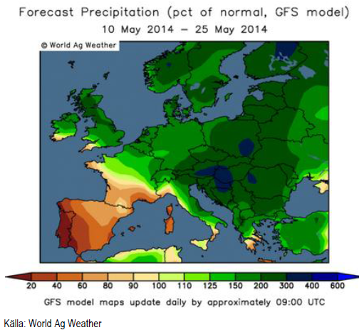 Enligt GFS-modellens 2-veckorprognos minskar torkan något i Kansas, Oklahoma och Texas. Det är fortfarande mer nederbörd än normalt i corn belt och för sojabönorna, men mer normalt än tidigare. Det underlättar för sådden av majs att blir klar och för starten av sådden av sojabönor.