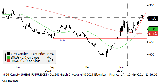 USDA förutspår att det genomsnittliga vetepriset under 2014/15 hamnar i intervallet 665 – 795 cent per bushel. SRWW ska då vara i den lägre delen och HRWW i den övre. Vi kan jämföra det med Chicagoterminen för decemberleverans som alltså stängde på 745 cent i fredags. Det är strax över mitten av det intervall som USDA estimerar är ”rätt” pris för terminen. Möjligtvis kan man resonera att det är SRWW och därmed ska ligga i den nedre delen. USDA rekommenderar alltså ”sälj” på terminen.