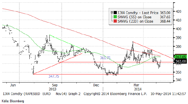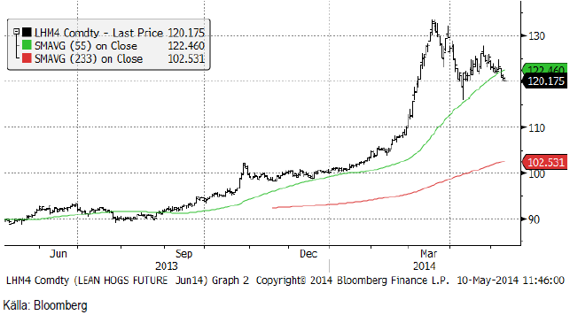 USDA estimerar att priset faller till 385 – 455 cent per bushel från prisintervallet 450 till 480 cent per bushel under 2013/14. I februaris Outlook Forum förutspådde de ett pris på 390 cent per bushel, så de är mindre negativa till prisutvecklingen nu. Decemberterminen ligger just nu på 498 cent och det är ju långt över vad USDA förutspår som genomsnittligt pris. Om det inte blir väderproblem någonstans, så kommer majspriset att gå in i en riktig bear market nu.