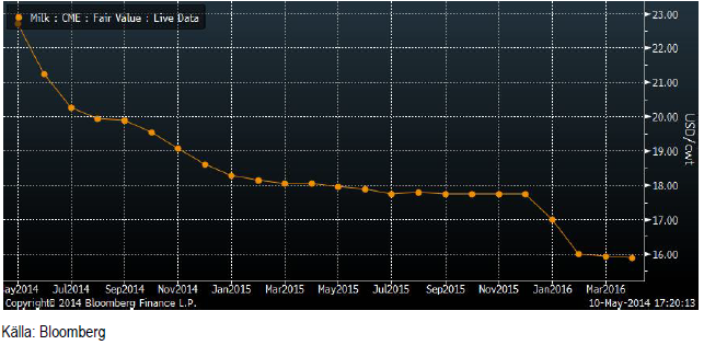 Nedan ser vi hur detta förhåller sig till dagens terminspriser för Milk Class 3. Priserna är i dollar per cwt.