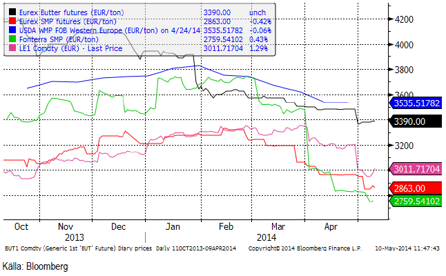 Smör och skummjölkspulver på EUREX har hållit sig stabila efter det senaste nedstället vid månadsskiftet. Fonterra har fortsatt att sjunka. SMP-terminerna i USA, som också började månaden väldigt svagt, har återhämtat lite av nedgången.