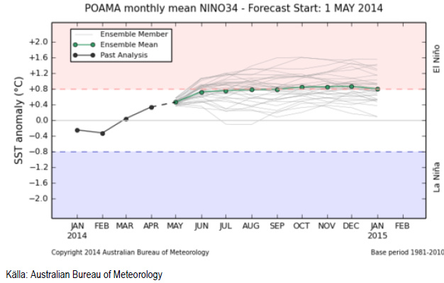 Samtidigt publicerade Bloomberg en artikel som på allvar varnade för konsekvenserna för den El Niño som enligt artikeln skulle inträffa (nästan helt säkert). Om ett El Niño inte inträffar, så innebär det att Australiens skörd av vete kan bli ca 25 mt som vanligt, och inte 15 mt. Det innebär också att kaffemarknaden inte drabbas av torka i Indonesien och Vietnam, två betydande producenter av robusta. Det innebär också att palmoljeproduktionen inte drabbas av torka. Informationen är alltså generellt sett ”bearish” för spannmål, vegetabiliska oljor och kaffe.