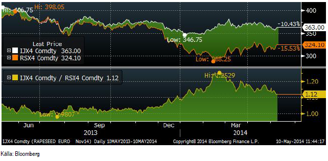 Skillnaden mellan kanadensisk canola i eurotermer och Matifs rapskontrakt (båda för novemberleverans) har sedan förra veckan minskat från 13% till 12%. Jag tycker fortfarande att spreaden är värd att sälja.