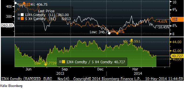 Nedanför ser vi kvoten mellan rapsfrö (november) och sojabönor (november, omräknat till euro. Kvoten ligger kvar på 41, samma som förra veckan. Den visar att sojabönor är dyra i förhållande till rapsfrö.