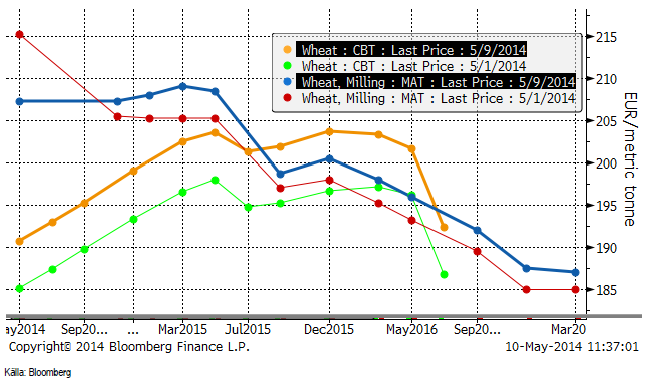 Nedan ser vi terminskurvorna för Chicagovete och Matif i fredags och veckan innan.