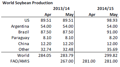 Det kom tre viktiga rapporter i veckan som gick. I torsdags publicerade först CONAB sin rapport för maj, där informationen om sojabönorna tilldrog sig mest intresse. Senare samma dag publicerade FAO/AMIS sin rapport för månaden och på fredagskvällen kom USDA med sin maj-rapport, som för första gången presenterade estimat för året 2014/15. FAO/AMIS rapport var överlag negativ för priserna på spannmål och oljeväxter och det var USDA:s rapport också, precis som vi väntat oss.