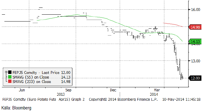 Potatis fortsatte prisfallet från förra veckans 12.80 till 12 blankt i fredags. I vintras var det möjligt att prissäkra på 15 euro.