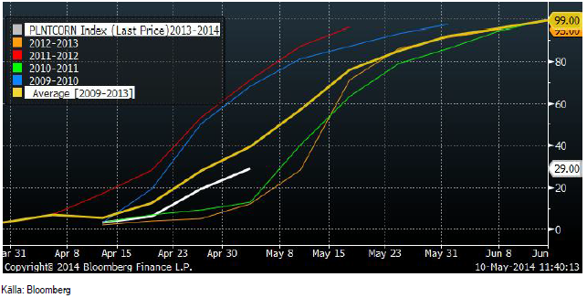 Den tredje plantings-rapporten i år, från i måndagen 21 april visade att 29% (förra veckan 19%) av majsarealen i USA var sådd per den 2 maj. Det var lite mindre än vad vi och marknaden hade väntat sig, men samtidigt kom rapporter om att ”planting window” öppnar sig, med varmare väder. Rapporten som kommer den 12 maj kommer förmodligen att visa 50 – 60% sått och om det gör det, så får marknaden ytterligare anledning att handla ner majspriset.
