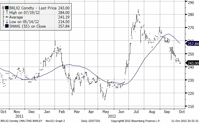 Med tanke på att det förmodligen kommer att sås en hel del vårgrödor i Sverige, t ex maltkorn, kan det vara särskilt intressant att fundera över prissäkring. Novemberkontraktet, som snart förfaller, har fortsatt att falla och är nu nere på 243 euro.