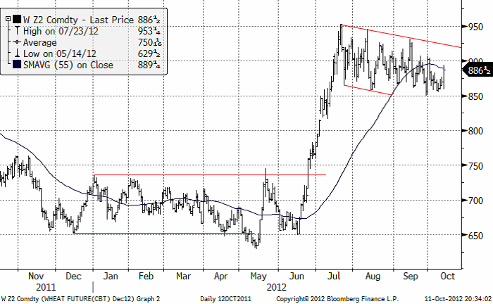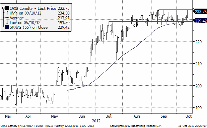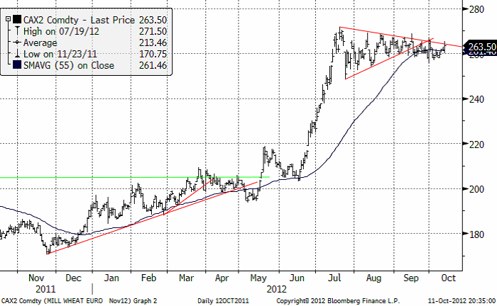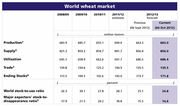 WASDE rapporten har kallats ”tråkig” därför att den var mer eller mindre i linje med förväntningarna. Men den är inte tråkig eftersom lagren är så otroligt låga. Priset ransonerar inte efterfrågan och under våren nästa år kan oron kanske växa en del mer. FAO:s senaste prognos över den globala spannmålsproduktionen 2012 har reviderats ned något sedan förra månadens estimat till 2 286 mt. Den senaste nedjusteringen beror främst på en mindre majsproduktion i de centrala och sydöstra delarna av Europa, och att spannmålsproduktionen i centrala produktionsområden som USA, Europa och Centralasien har påverkats av kraftig torka. De allra första indikationerna för produktionen av vete 2013 ser dock positiva ut, då sådden av höstvete på det norra halvklotet redan har kommit långt som en följd av i allmänhet gynnsamma väderförhållanden.