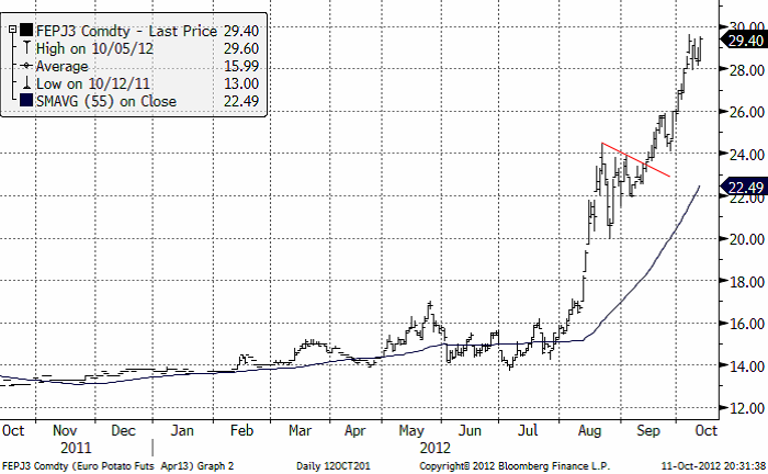 Priset på potatis har stabiliserat sig över 28 euro. 28 euro är nu ett tekniskt stöd. Frågan är om priset kommer att nå 30. Det ser så ut.