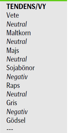 USDA justerade ner prognosen för utgående lager i majs till den lägsta nivån sedan 1973. Innan nästa skörd på norra halvklotet väntas lagren räcka i 45 dagar. 1973 var lagret 37 dagars global konsumtion. Vetelagren i Europa väntas vara på riktigt låg nivå den sista juni. Vi är inte negativa till priset på spannmålen majs, vete och maltkorn, utan neutrala. Vi kan inte avgöra om den ansträngda lagersituationen kommer att leda till högre priser eller om ransonering av efterfrågan kommer att vara tillräcklig.