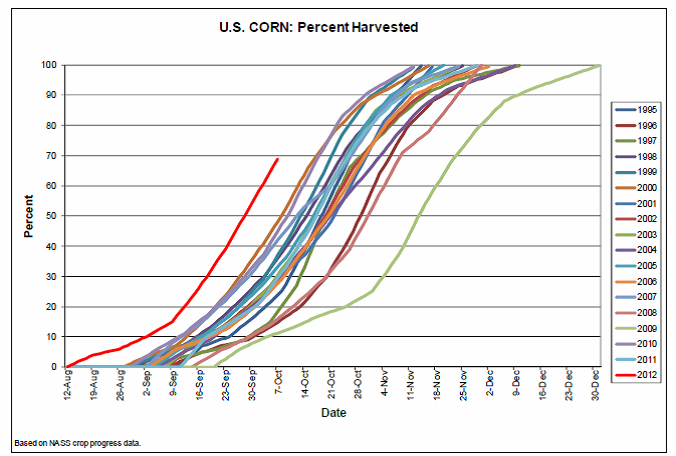 Tisdagens Crop Progress från USDA visar att den amerikanska majsskörden fortsätter framåt i snabb takt och var avklarad till 69% per i söndags, jämfört med förra veckans 54% och en bra bit över det femåriga genomsnittet på 28%. Skördetakten i de olika ”I” staterna (Iowa, Indiana och Illinois) varierade, men samtliga ligger över genomsnittet.