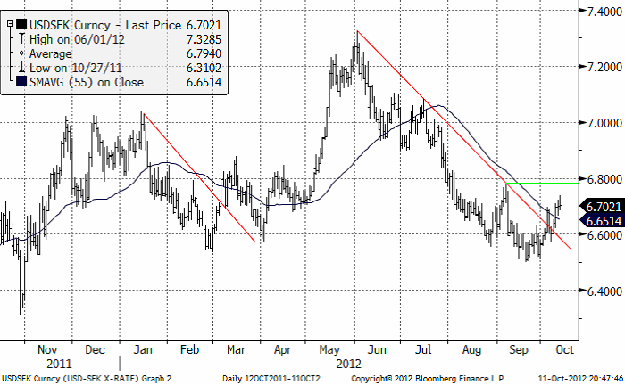 Dollarn som fallit mot kronan ser ut att ha funnit en botten. Det skedde ett trendbrott, som vi skrev om i förra brevet, i veckan som gick. Trenden är nu uppåtriktad på kort sikt. Motståndet ligger på 6.78, som vi har från toppen i början på september.