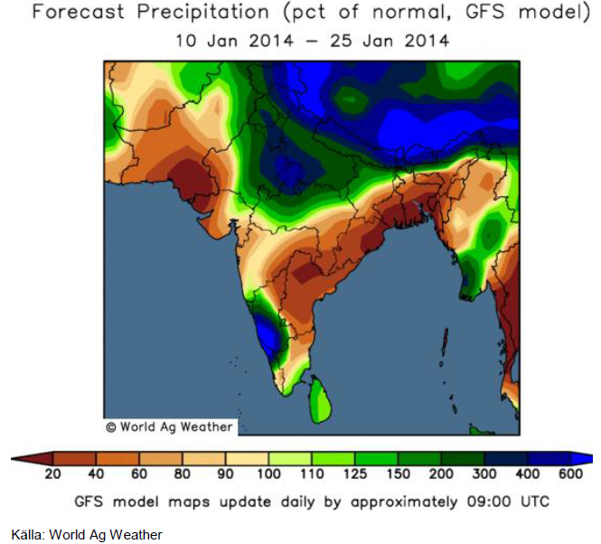 Även Indien är till stora delar torrare än normalt, som vi ser i prognosen nedanför.