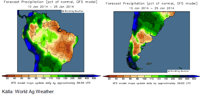 Norra Brasilien har normal nederbörd och den tidigare torra södra delen och norra Argentina väntas få ordentligt med nederbörd. Södra delarna av Argentina väntas fortsatt lida av torka.