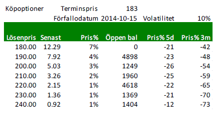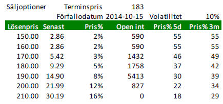Nedan ser vi priserna på köpoptioner på Matif på November-2014 (Matif vete).