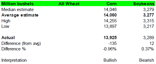 Nedan ser vi förväntningarna och utfallet för WASDE-rapportens utgående lager för USA.