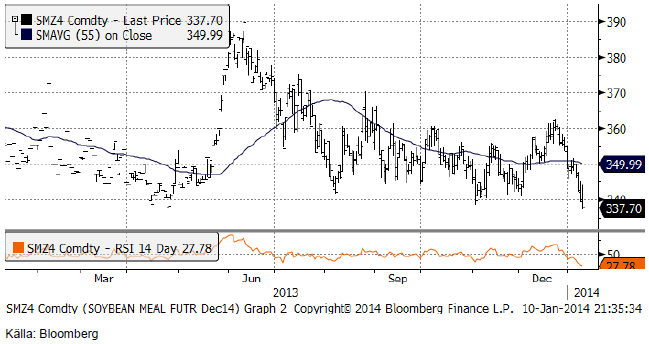 November 2014-kontraktet på raps ligger precis på det tekniska stöd som bottennoteringen i månadsskiftet juli/augusti också vände upp från. Det skulle inte förvåna om det kom en rekyl uppåt från den här nivån, men fundamenta är överlag negativa med kraftigt fallande pris på canola i Winnipeg och med det prisfall på soja som varit.
