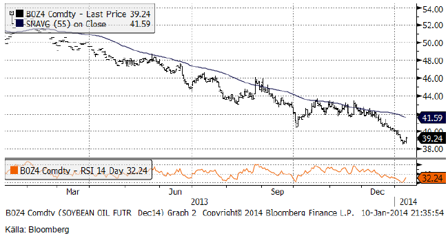 Sojaoljan, som har fallit stadigt, har rekylerat uppåt. Nu är det alltså sojaoljan som är stark och sojamjölet som är svagt.