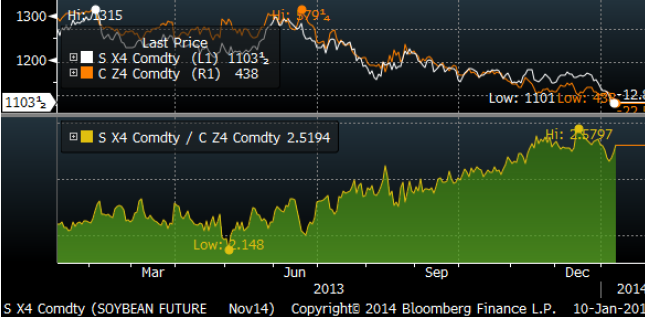 I diagrammet nedan ser vi hur prisutvecklingen på November bönor och december majs, och kvoten mellan dem. Trots att sojabönorna tappat lite mark i förhållande till majsen sedan toppen, har sojabönors attraktivitet som gröda ökat stort på majsens bekostnad sedan i somras.