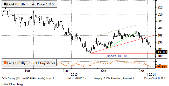 Det nya året inleddes med ”decline and fall” för att citera Evelyn Waugh. Matif hann återigen inte hänga med i fredagens kursfall på Chicagobörsen, vilket gör att prisfall väntar när börsen öppnar kvart i elva på måndag. Det finns ett tekniskt stöd på 181.40, bottennoteringen från i somras och detta kommer antagligen att testas i veckan. Vi bedömer sannolikheten som stor att priset förr eller senare kommer att gå ännu lägre.