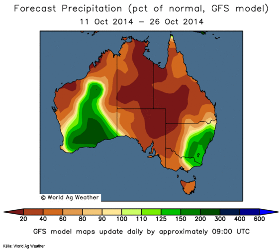 I Brasilien har den extremt torra prognosen fått ge vika för mer normal nederbörd. Minas Gerais norra delar väntas få något över normal nederbörd. Mato Grosso, den stora sojaprocenten, väntas få 60-80% av normal nederbörd, vilket är väsentligt bättre än 0 – 40%, som förra veckans prognoskarta sade.