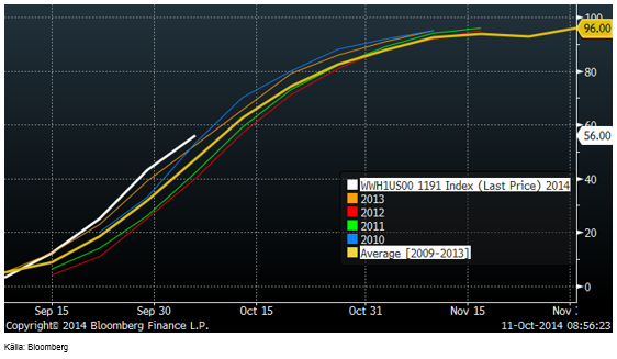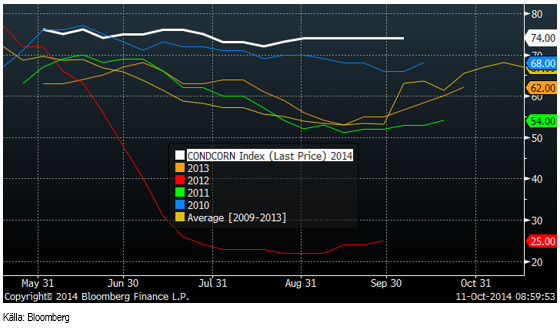 December 2014 – kontraktet på majs i Chicago handlas på 334 cent. Nästa års skörd, CZ5, handlas på 381.75 cent. Vi vet att hälften av lantbrukarna i USA har en kostnad på 400 cent per bushel och då är nästa års terminspris i lägsta laget för att man inte ska förvänta sig väsentligt lägre areal nästa år. Man ska komma ihåg att 334 cent för årets skörd avser majs som befinner sig i en silo, redo att lastas på fartyg. ”Farmgate-” priset är lägre. Det har talats om priser ner mot 200 cent på en del ställen.