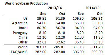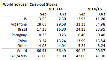 FAO räknar med att global konsumtion ökar med 7-8% på årsbasis, väsentligt högre än de 5% årlig tillväxt de hade för 2013/14. De ser en stark efterfrågan på både sojaolja och sojamjöl. FAO sänker därför utgående lager med 1 mt från september till oktober till 41 mt. Detta är ändå 10 mt högre utgående lager än FAO såg för 2013/14.