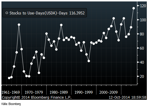Globala lager räcker till näsan 120 dagars konsumtion. Det är väsentligt högre än de ca 80 dagar som det var för ett par år sedan. Lager i termer av konsumtion är på global basis på den högsta nivån sedan 1961. Det perspektivet är knappast ”bullish” på lite längre sikt.