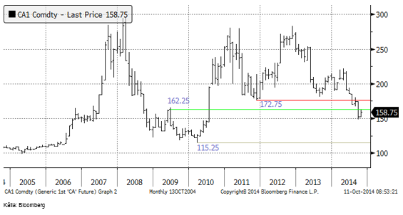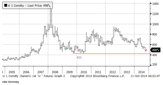 I nedanstående diagram ser vi hur Matifs ”spotkontrakt” utvecklat sig de senaste tio åren. Priset är på en nivå som tidigare varit bottennivåer. Därmed ska man inte utgå från att priset vänder upp från den här nivån genast. Tidigare har priset stannat på en låg nivå i flera månader, innan det vänt upp igen.