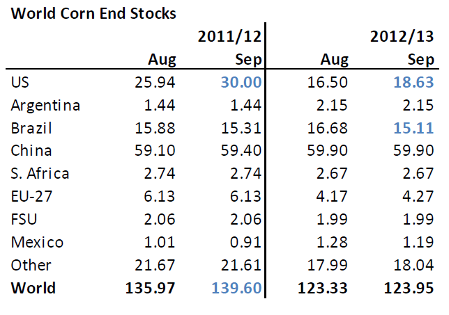 Notera den märkliga höjningen av utgående lager för 2011/12 i USA. Det här kommer från den tidiga skörden, där 11% av amerikansk majs är skördat före den 1 september. De skriver så här: “150 Mbu old crop corn displaced from feed due to early new crop, which will also boost old crop stocks”. Men vänta lite… borde inte detta på något sätt ha påverkat 2012/13? 11% mindre hamnar trots allt på 2012/13.