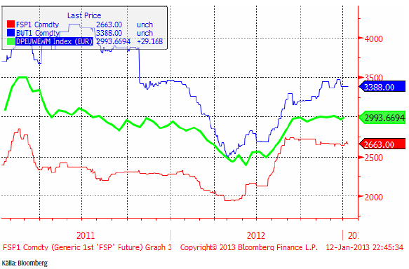 Slutligen så den gröna linjen. Den visar priset på helmjölkspulver (WMP) FOB Västeuropa. Källan är USDA och priserna uppdateras varannan vecka. Vi ser att WMP-priset legat stabilt det fjärde kvartalet förra året, med en liten nedgång mot slutet av året. 2013 har dock börjat med en liten prisuppgång.