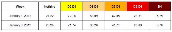 Sedan förra veckan har alla kategorier av torka (D0 – D4) minskat, som vi ser i nedanstående tabell.